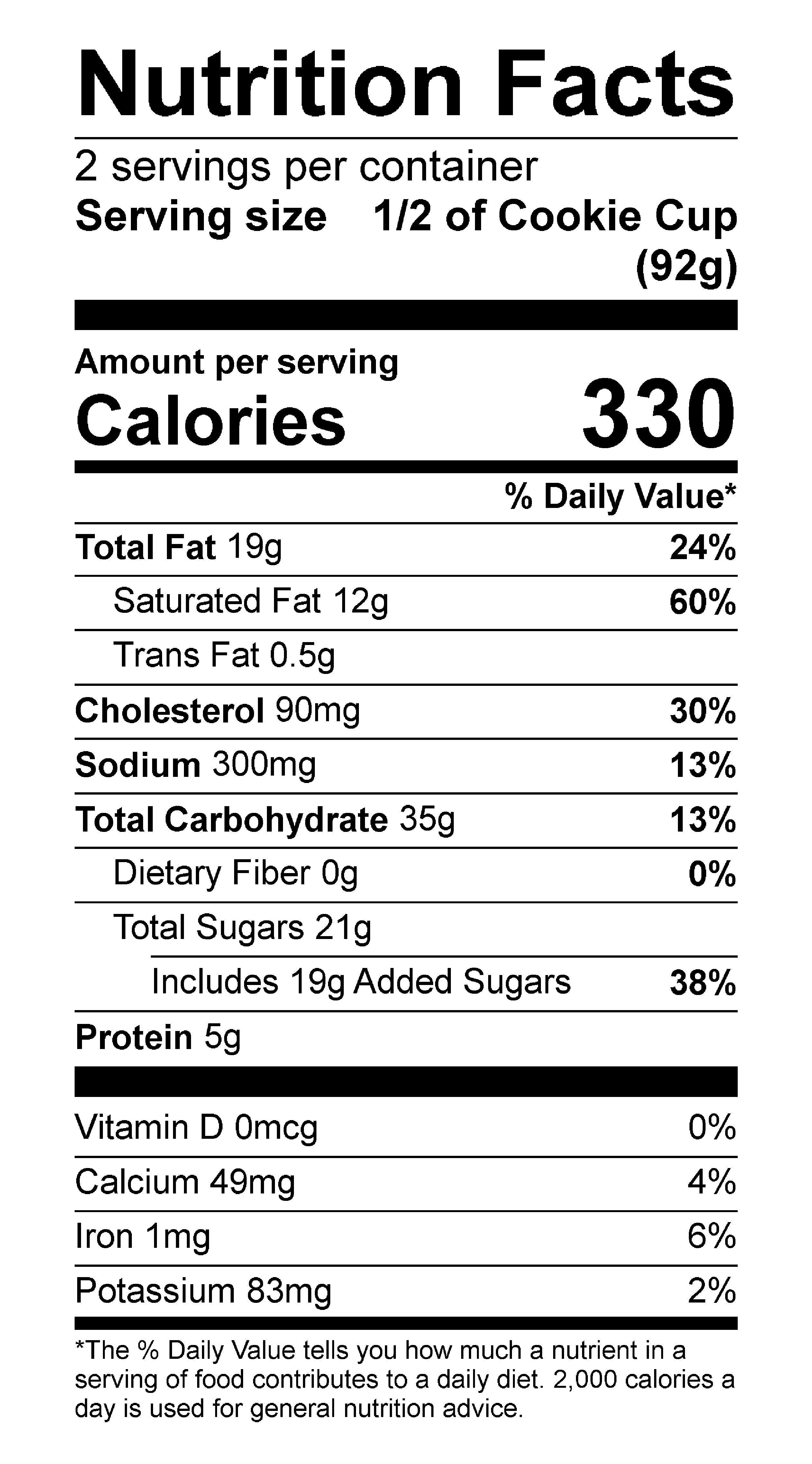 Sugar, Enriched Wheat Flour (Unbleached Hard Wheat Flour, Malted Barley Flour, Niacin, Reduced Iron, Thiamin, Mononitrate, Riboflavin, Folic Acid), Butter (Pasteurized Cream, Salt), Eggs, Margarine (Palm Oil, Soybean Oil, Water. Contains 2% or Less of: Salt, Nonfat Dry Milk, Distilled Monoglycerides, Soy Lecithin, Extra Virgin Olive Oil, Natural Flavor, Vitamin A Palmitate, Beta-Carotene (Color)), Bleached Enriched Flour (Wheat Flour, Niacin, Reduced Iron, Thiamine Mononitrate, Riboflavin, Folic Acid), Cocoa Powder, Food Starch - Modified, Contains Less Than 2% of Salt, Natural Vanilla Flavor (Glycerin, Water, Ethanol, Natural Flavor, Caramel Color), Natural Vanilla Flavor (Madagascar Bourbon Vanilla Extractives and Natural Flavor in Water, Propylene Glycol, Ethyl Alcohol, Glycerin and Sugar).