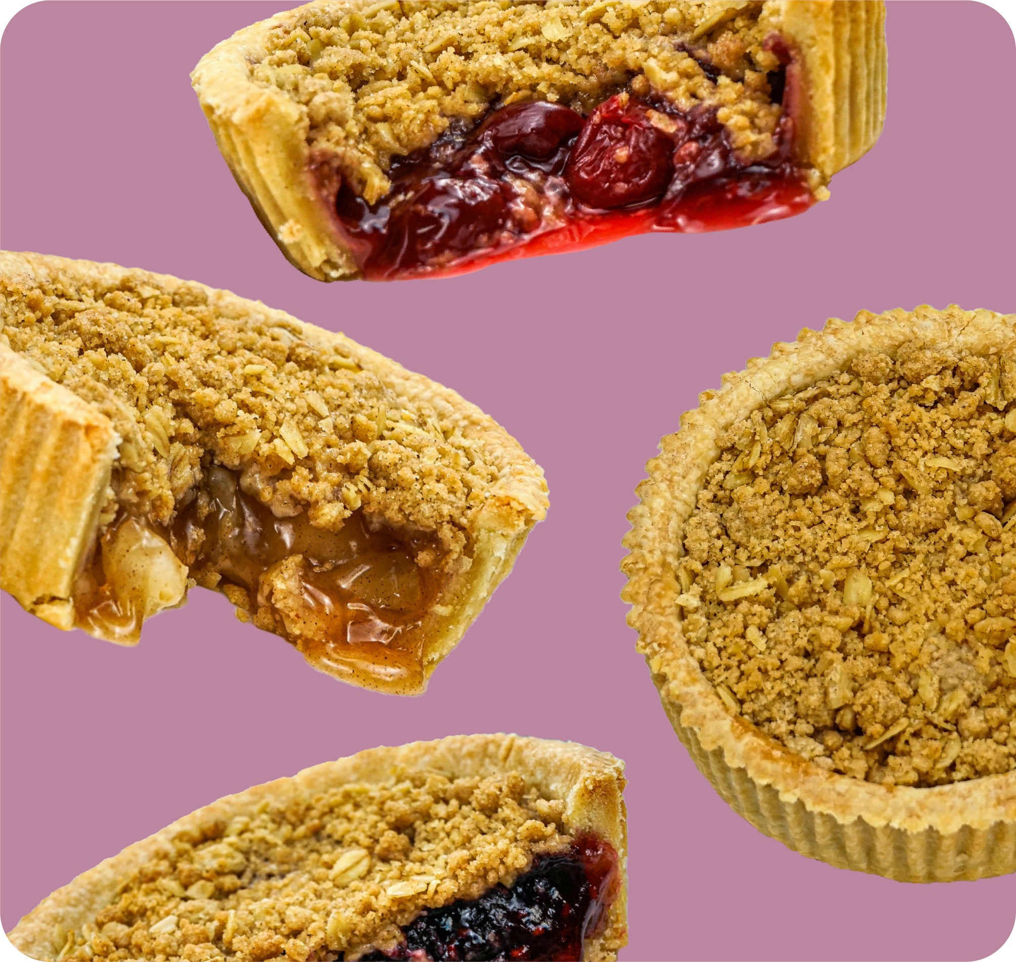 This box celebrates the nostalgic, timeless flavors of sweet fruit and crunchy oat streusel topping. These 4” petite pie flavors include: