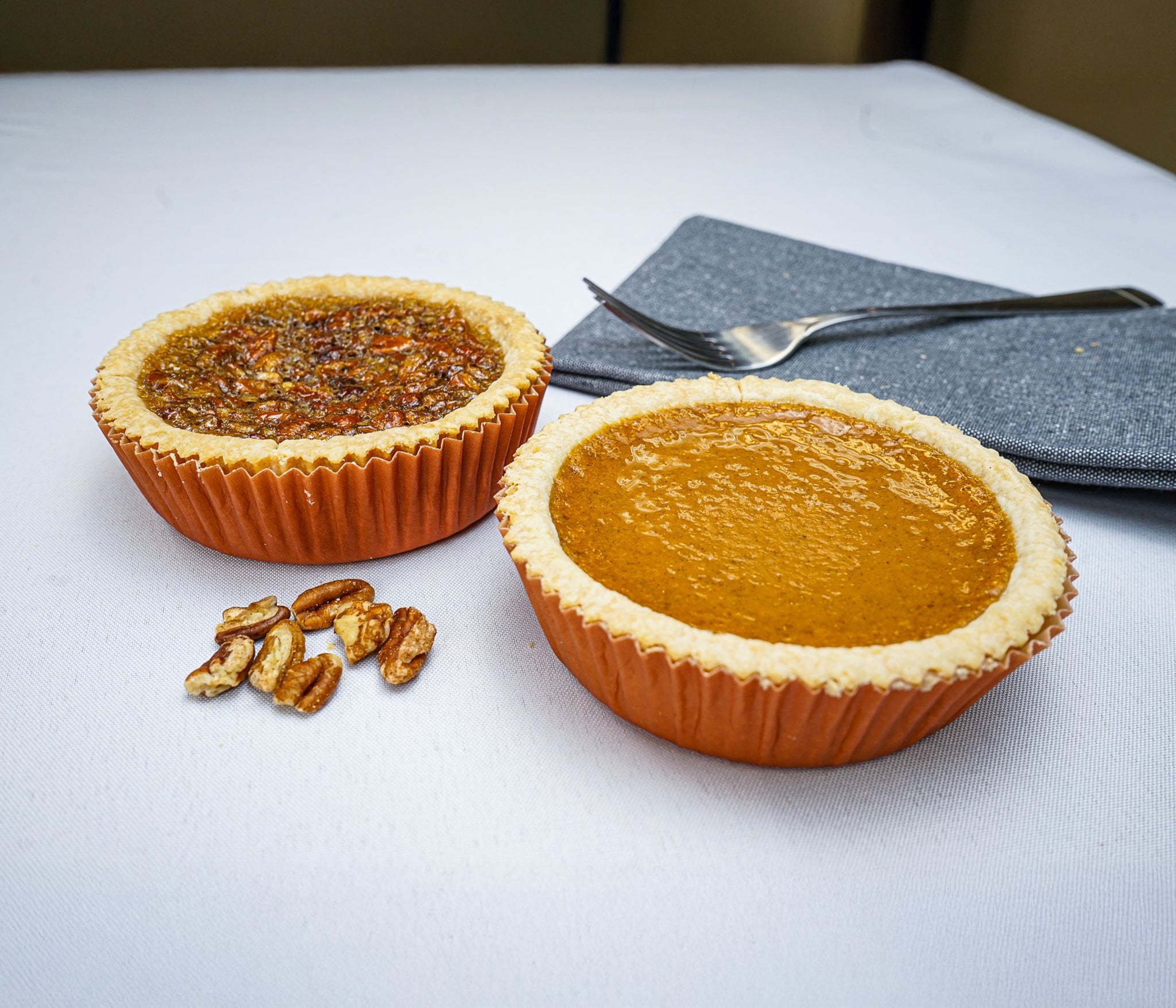- 2 Pecan Pies: A buttery, flaky crust holds a rich filling of toasted pecans in a caramelized sauce, offering a comforting, sweet aroma and flavor in every bite.