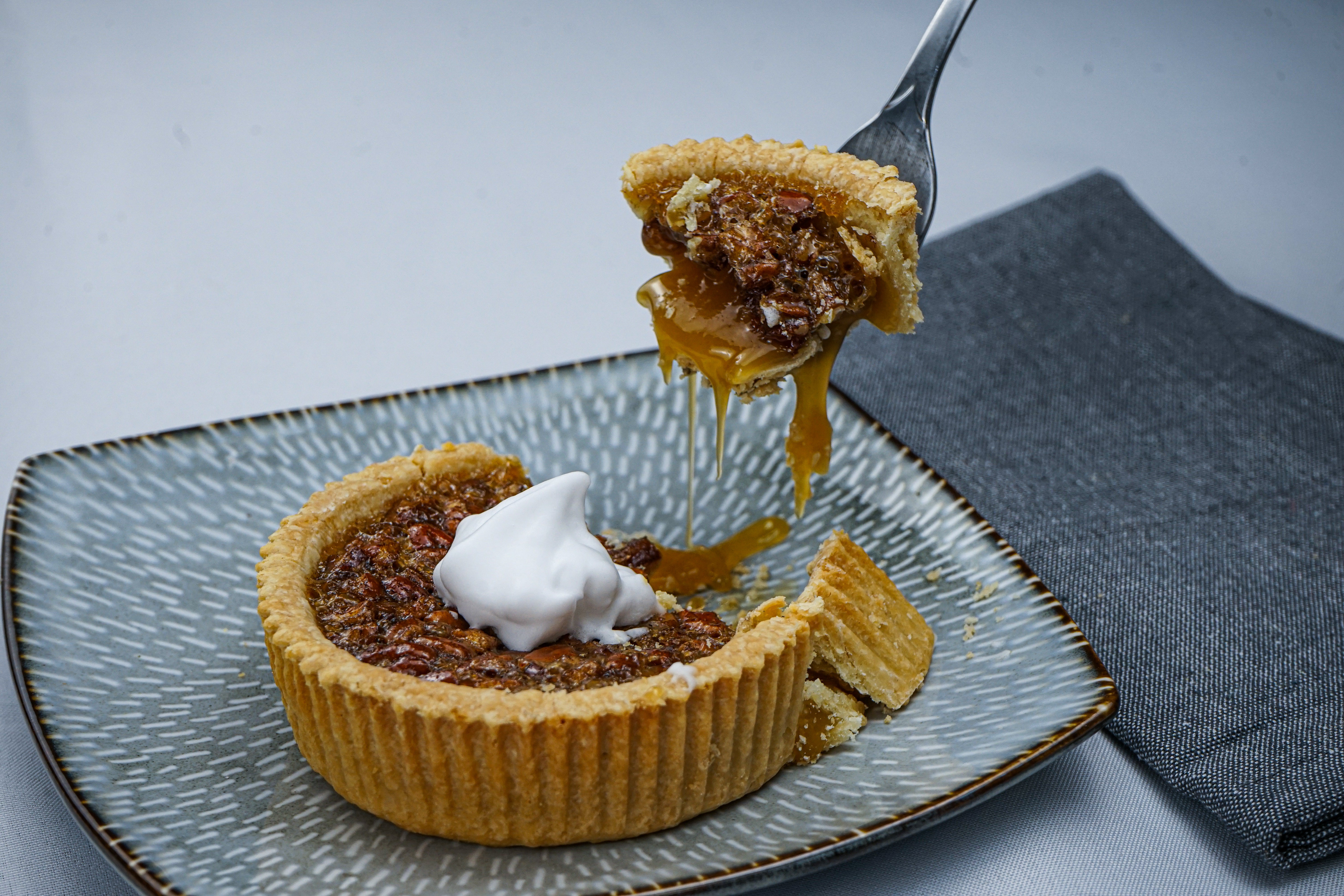 A buttery, flaky crust holds a rich filling of toasted pecans in a caramelized sauce, offering a comforting, sweet aroma and flavor in every bite.